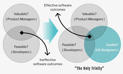 So I socialized the idea that Product Managers should push back on design they feel doesn’t facilitate desired capabilities. And that Developerss should push back on design they think will take too long to implement. But that they should both expect a conversation with UX when either presented objections of any other kind. This shift steadily moved us toward a far “holier” dynamic ( right ).