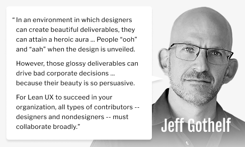 But by starting small and focusing on actual changes to actual production code, Mike and I were able to operationalize the iterative, collaborative process Gothelf describes in his industry-shifting book, Lean UX. And in so doing, we were able to build a rythm over time and maintain momentum .